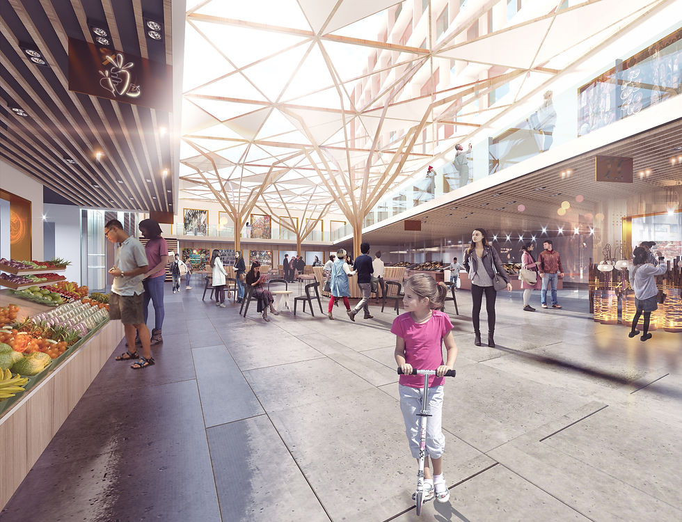 The general monolith is emptied to allow natural lightning to create an interior covered Market Plaza and bring natural light to the different office stories. The plaza gives therefore different shops accesses from the street and inside the plaza, while creating a protected area that host temporary weekly market stalls.